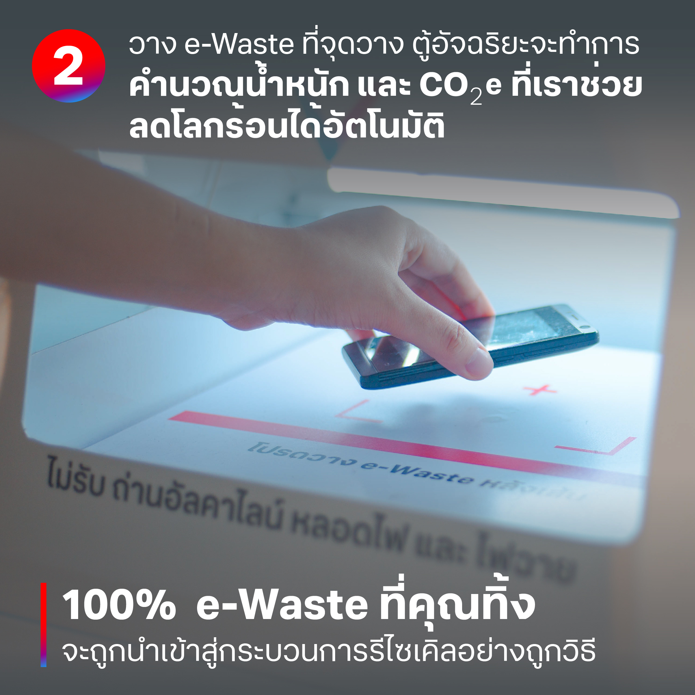 2.เมื่อช่องทิ้งเปิดออก ให้วางขยะอิเล็กทรอนิกส์ (e-Waste) ที่จุดวาง จากนั้น ตู้จะทำการคำนวณน้ำหนักพร้อมก๊าซคาร์บอนไดออกไซด์เทียบเท่า (CO2e) ที่สามารถลดได้จากการทิ้งขยะอิเล็กทรอนิกส์ให้อัตโนมัติ