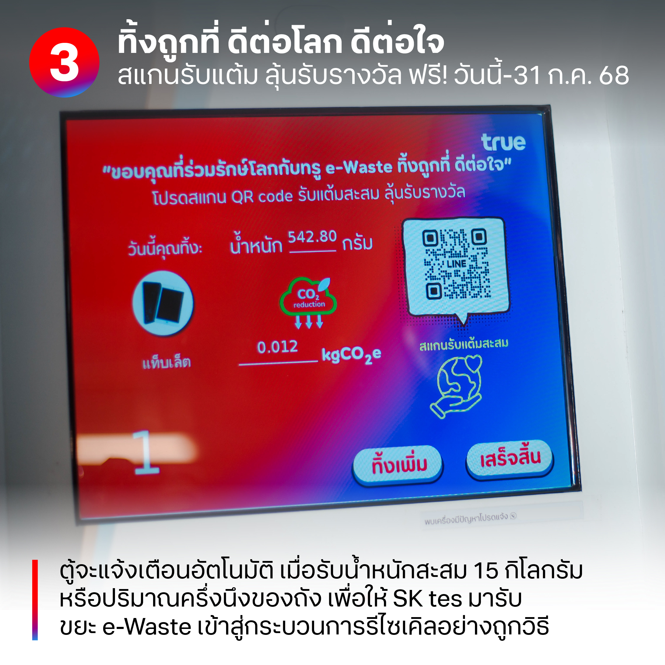 3.นอกจากนี้ ยังสามารถสแกน QR code เพื่อสะสมแต้มรับของรางวัลจากทรูคอฟฟี่ แถมทุกการทิ้ง ยังได้ลุ้นรับรางวัลรักษ์โลกอีกด้วย และหากตู้รับน้ำหนักสะสมครบ 15 กิโลกรัม หรือเทียบเท่าปริมาณครึ่งหนึ่งของถัง ตู้จะแจ้งเตือนทีมงานอัตโนมัติ เพื่อให้ SK tes มารับขยะอิเล็กทรอนิกส์ เข้าสู่กระบวนการรีไซเคิลอย่างถูกวิธีต่อไป
