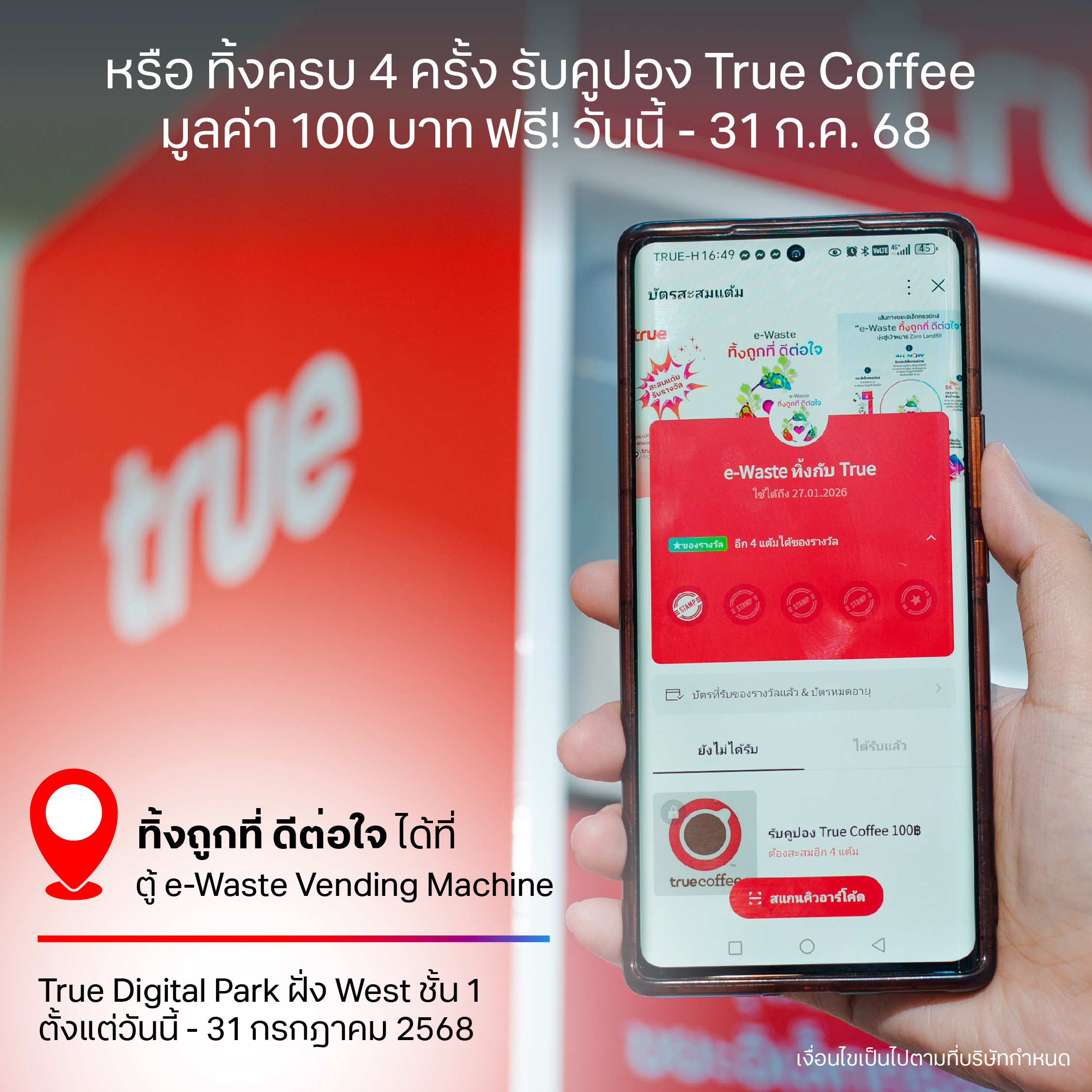 มาทิ้งถูกที่ ดีต่อใจกันได้เลย…สะสมแต้ม ทิ้งขยะ e-Waste ครบ 4 ครั้งที่ตู้ e-Waste Vending Machine ณ True Digital Park ฝั่ง West ชั้น 1…รับทันที คูปอง True Coffee มูลค่า 100 บาท ฟรี! ตั้งแต่วันนี้ – 31 กรกฎาคม 2568