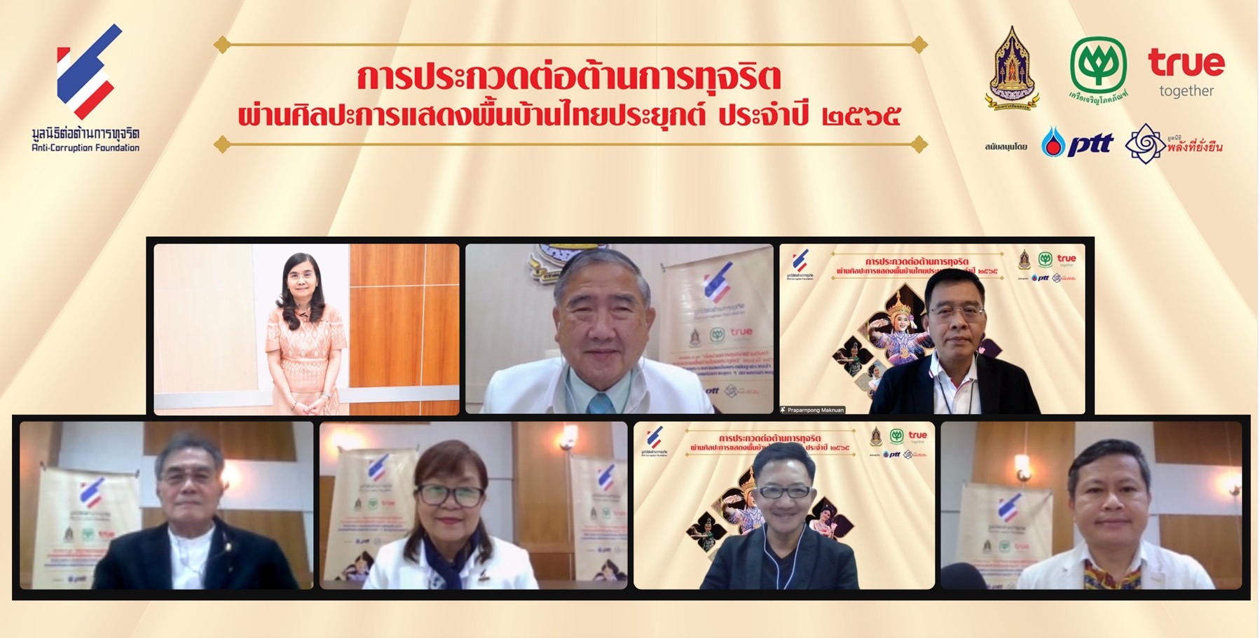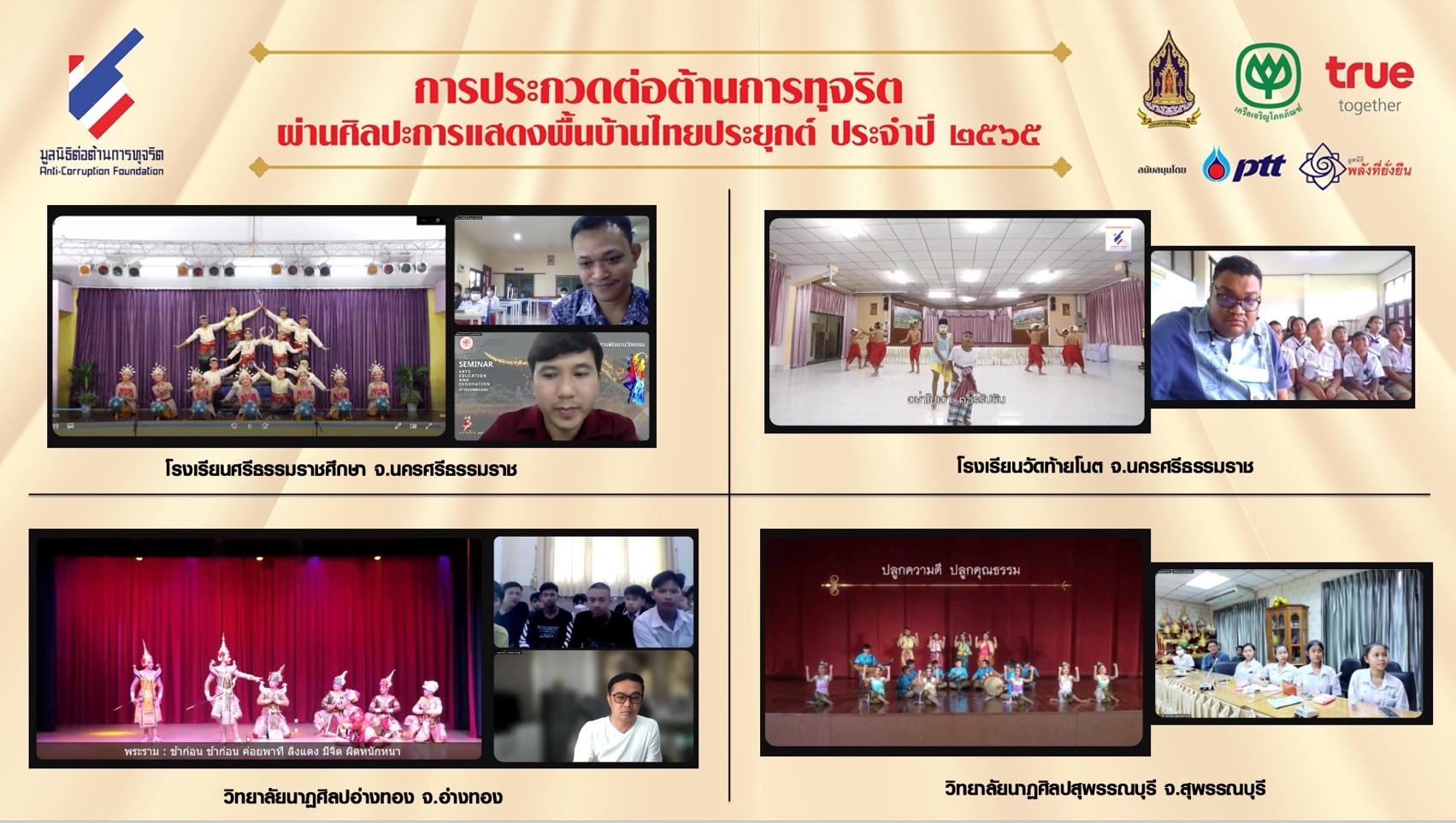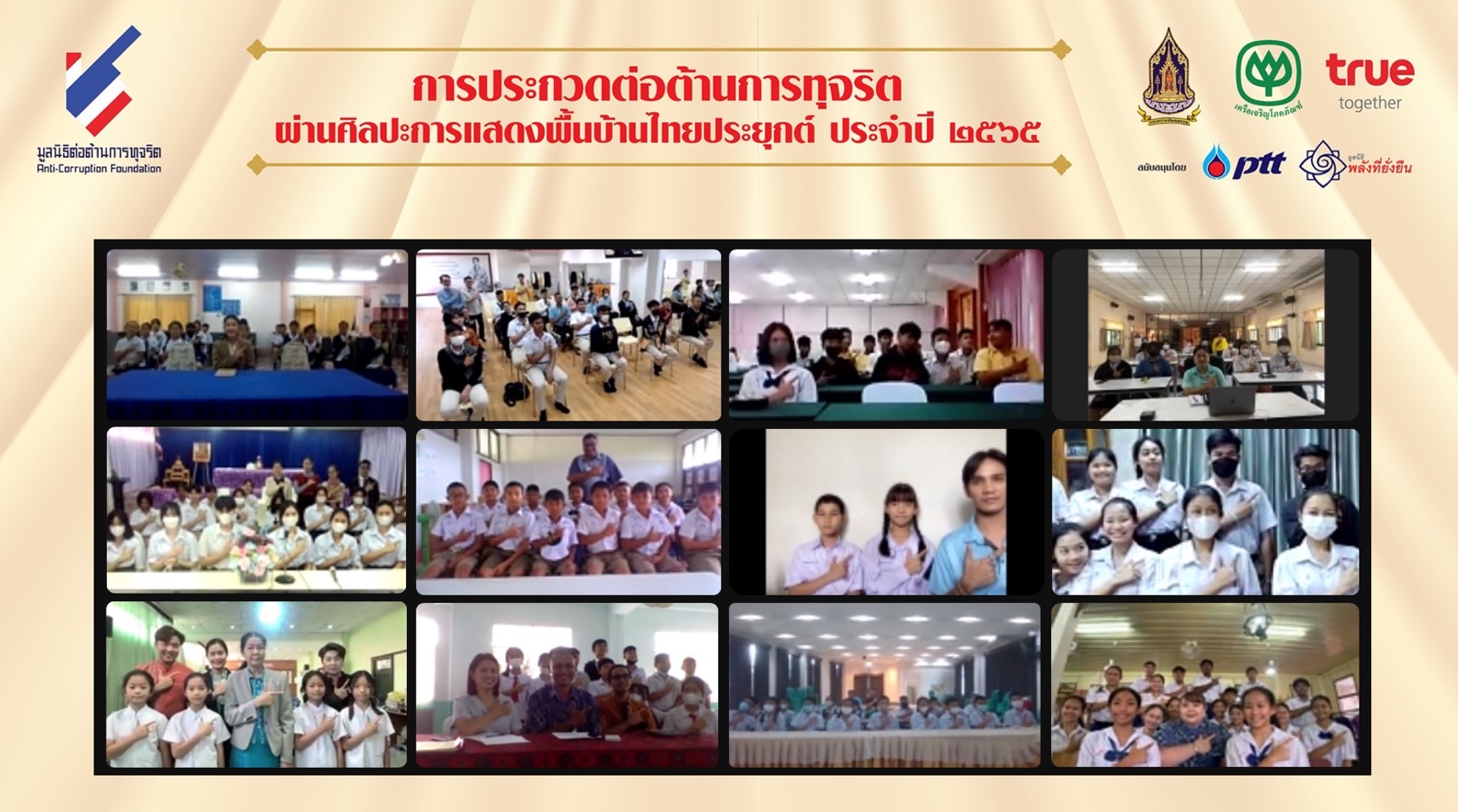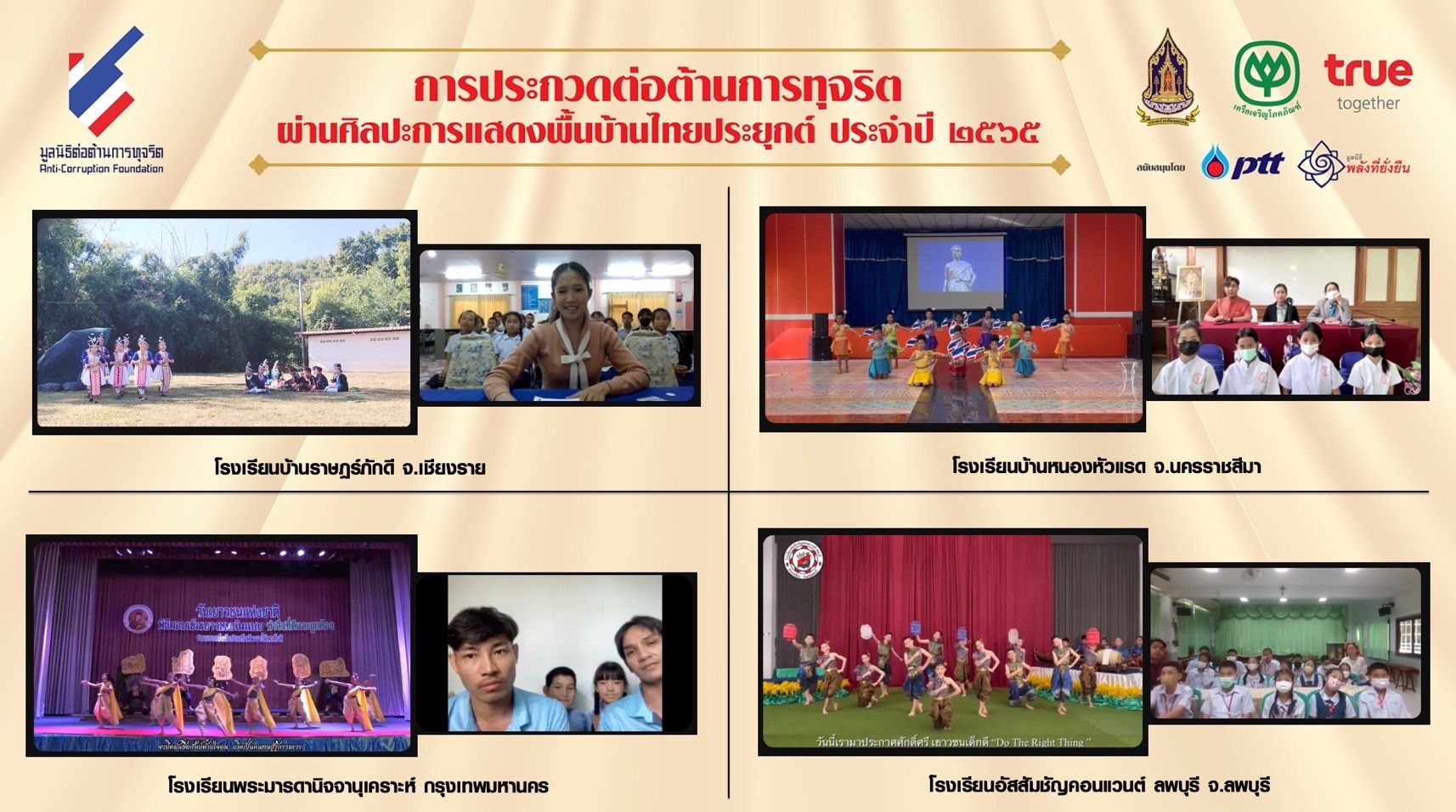 28 มกราคม 2566 : มูลนิธิต่อต้านการทุจริต, กระทรวงวัฒนธรรม, เครือเจริญโภคภัณฑ์ และกลุ่มทรู จัดกิจกรรมอบรมพัฒนาการแสดงให้กับ 12 ทีมสุดท้าย ที่ผ่านเข้าสู่รอบชิงชนะเลิศ พร้อมโค้ชเพื่อรับฟังคำแนะนำก่อนเข้าประกวดในรอบชิงชนะเลิศ โครงการประกวด ‘ต่อต้านการทุจริตผ่านศิลปะการแสดงพื้นบ้านไทยประยุกต์’ ประจำปี 2565 ชิงถ้วยพระราชทานสมเด็จพระกนิษฐาธิราชเจ้า กรมสมเด็จพระเทพรัตนราชสุดา ฯ สยามบรมราชกุมารี พร้อมทุนการศึกษา มูลค่ากว่า 685,000 บาท
