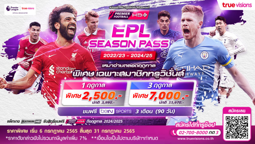 กรุงเทพฯ 8 กรกฎาคม 2565 – แฟนพรีเมียร์ลีกเฮต่อเนื่อง…ทรูวิชั่นส์ ตอกย้ำ KING OF SPORTS ด้วยการคว้าลิขสิทธ์พรีเมียร์ลีก ฟุตบอลลีกอันดับ 1 ของโลกแต่เพียงผู้เดียว ต่อเนื่องไปอีก 3 ฤดูกาล 2022/2023 – 2024/2025 พร้อมเอาใจสมาชิกทรูวิชั่นส์ด้วยราคาแพ็กเกจสุดพิเศษให้คอลูกหนังได้สนุกสุดคุ้มกันเต็มที่ก่อนใคร กับแพ็กเกจพิเศษ “EPL SEASON PASS” ชมสดเต็มอิ่ม ครบทุกคู่ ทุกสนาม แบบเอ็กซ์คลูซีฟ 380 แมตช์ต่อฤดูกาล ผ่านทุกแพลตฟอร์ม เชียร์แบบเกาะติดขอบสนามไม่พลาดแม้แต่แมตช์เดียว คมชัด แบบเอชดีทุกจอ ทั้งบนจอโทรทัศน์ สมาร์ทโฟน และออนไลน์ ประเดิมนัดเปิดสนามวันที่ 6 ส.ค. นี้ ทั้งการถ่ายทอดสด รีรัน และไฮไลท์ พร้อมเพิ่มอรรถรสให้แฟนบอลได้เชียร์สะใจยิ่งขึ้น คุ้มค่าการรอคอย พิเศษ!! เฉพาะลูกค้าทรูวิชั่นส์ เลือกรับชม 1 ฤดูกาล เพียง 2,500 บาท (จากปกติ 3,990 บาท) หรือเหมาจ่ายตลอด 3 ฤดูกาล เพียง 7,000 บาท (จากปกติ 11,970 บาท) พร้อมชมฟรี บีอิน สปอร์ตส์ 3 เดือน (90 วัน) เริ่มตั้งแต่วันที่ 6 – 31 กรกฎาคม 2565 เท่านั้น
