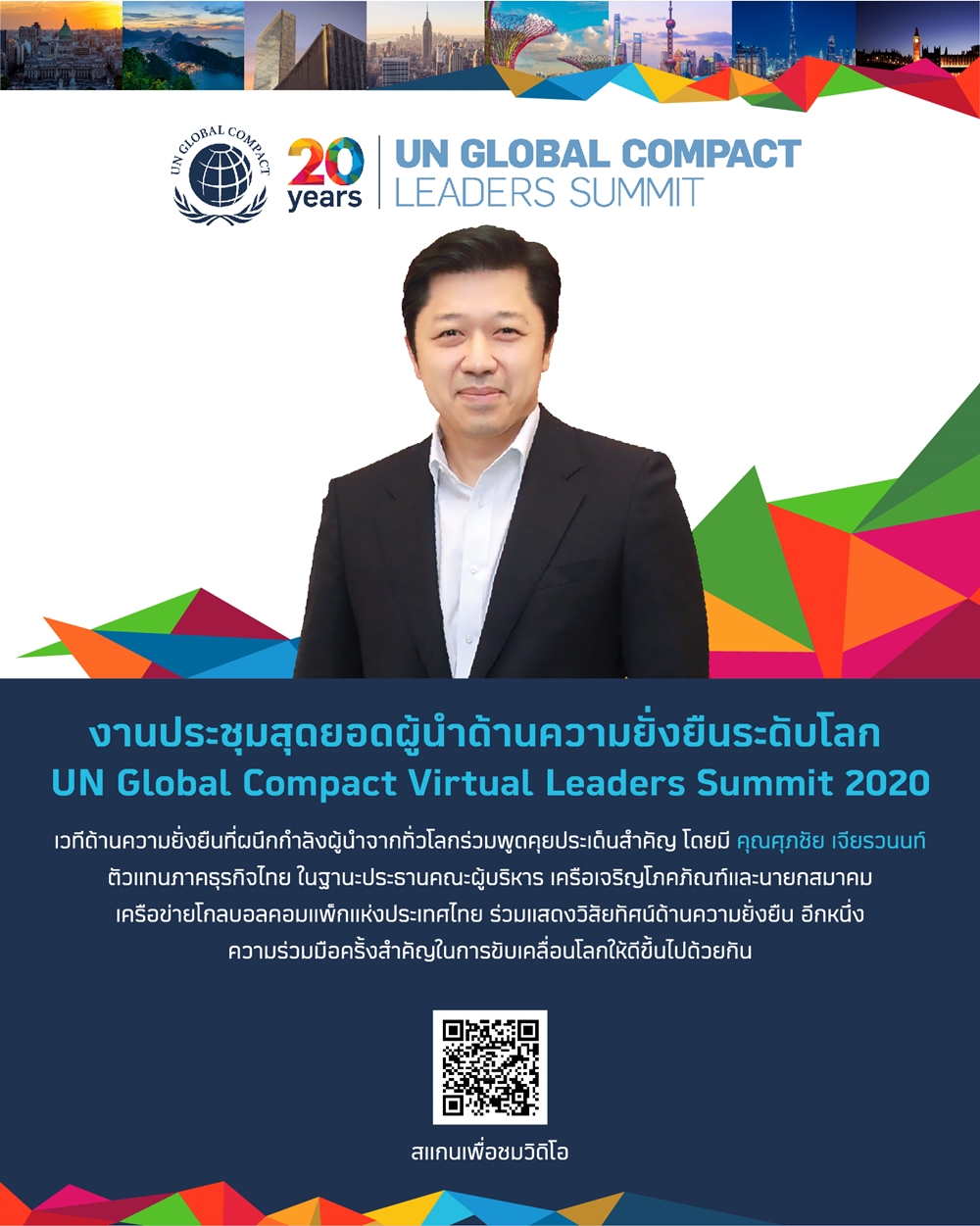 ผ่านไปแล้วกับการประชุมสุดยอดผู้นำสมาคมเครือข่ายโกลบอลคอมแพ็ก ในโอกาสครบรอบ 20 ปี UN Global Compact เวทีด้านความยั่งยืนที่ผนึกกำลังผู้นำจากทั่วโลก ร่วมพูดคุยประเด็นสำคัญ โดยมี คุณศุภชัย เจียรวนนท์ ตัวแทนภาคธุรกิจไทย ในฐานะประธานคณะผู้บริหาร เครือเจริญโภคภัณฑ์ และนายกสมาคมเครือข่ายโกลบอลคอมแพ็กแห่งประเทศไทย ร่วมแสดงวิสัยทัศน์ด้านความยั่งยืน อีกหนึ่งความร่วมมือครั้งสำคัญในการขับเคลื่อนโลกให้ดีขึ้นไปด้วยกัน