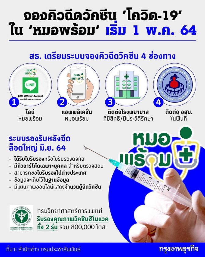 จองคิว ฉีดวัคซีนโควิด-19 ใน ‘หมอพร้อม’ เริ่ม 1 พ.ค. นี้ 26 เมษายน 2564SystemNews, กิจกรรมเพื่อสังคม, รวมพลังสู้โควิด19 กระทรวงสาธารณสุข เตรียมระบบจองคิวฉีดวัคซีน 4 ช่องทาง ดังนี้ LINE หมอพร้อม (ได้ทั้ง IOS และ Android) แอปพลิเคชัน หมอพร้อม โรงพยาบาลที่มีสิทธิ/มีประวัติรักษา อสม. ในพื้นที่ Cr. กรุงเทพธุรกิจ Post Views: 4,082