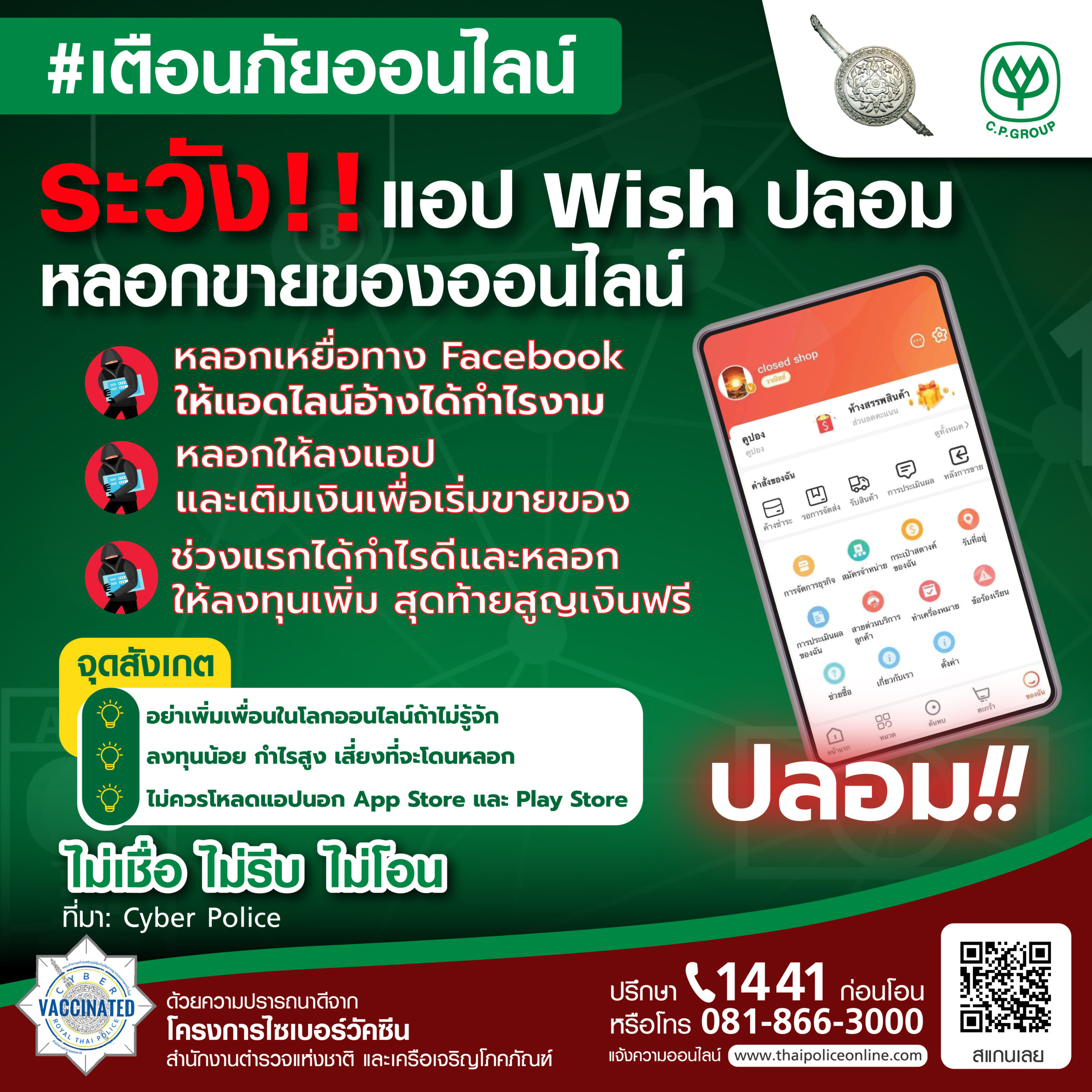 คดีหลอกลวงให้โอนเงินเพื่อทำงานหารายได้พิเศษว่า ขณะนี้มีกลุ่มมิจฉาชีพชักชวนให้ลงทุนในแอปพลิเคชันปลอม Wish Shop โดยโฆษณาทางเฟซบุ๊กชักชวนให้ลงทุนโดยใช้รูปและโปรไฟล์ที่น่าเชื่อถือ ผู้เสียหายหลงเชื่อทักสอบถาม มิจฉาชีพคนที่ 1 จึงให้แอดไลน์ มิจฉาชีพคนที่ 2 เพื่อแจ้งรายละเอียดการทำงาน โดยให้ผู้เสียหายโหลดแอปพลิเคชัน Wish ปลอม (นอก Play Store) สมัครสมาชิก และตั้งชื่อร้าน โดยให้ทำตามขั้นตอน เริ่มจากลงทะเบียน เลือกสินค้ามาขายโดยมีเงื่อนไขและจำนวนที่จะทำให้ผ่านภารกิจ และต้องเติมเงินก่อนขายทุกครั้ง ช่วงแรกให้สั่งซื้อสินค้าครั้งละ 3 ชิ้นและสามารถถอนเงินทุนและกำไรคืนได้