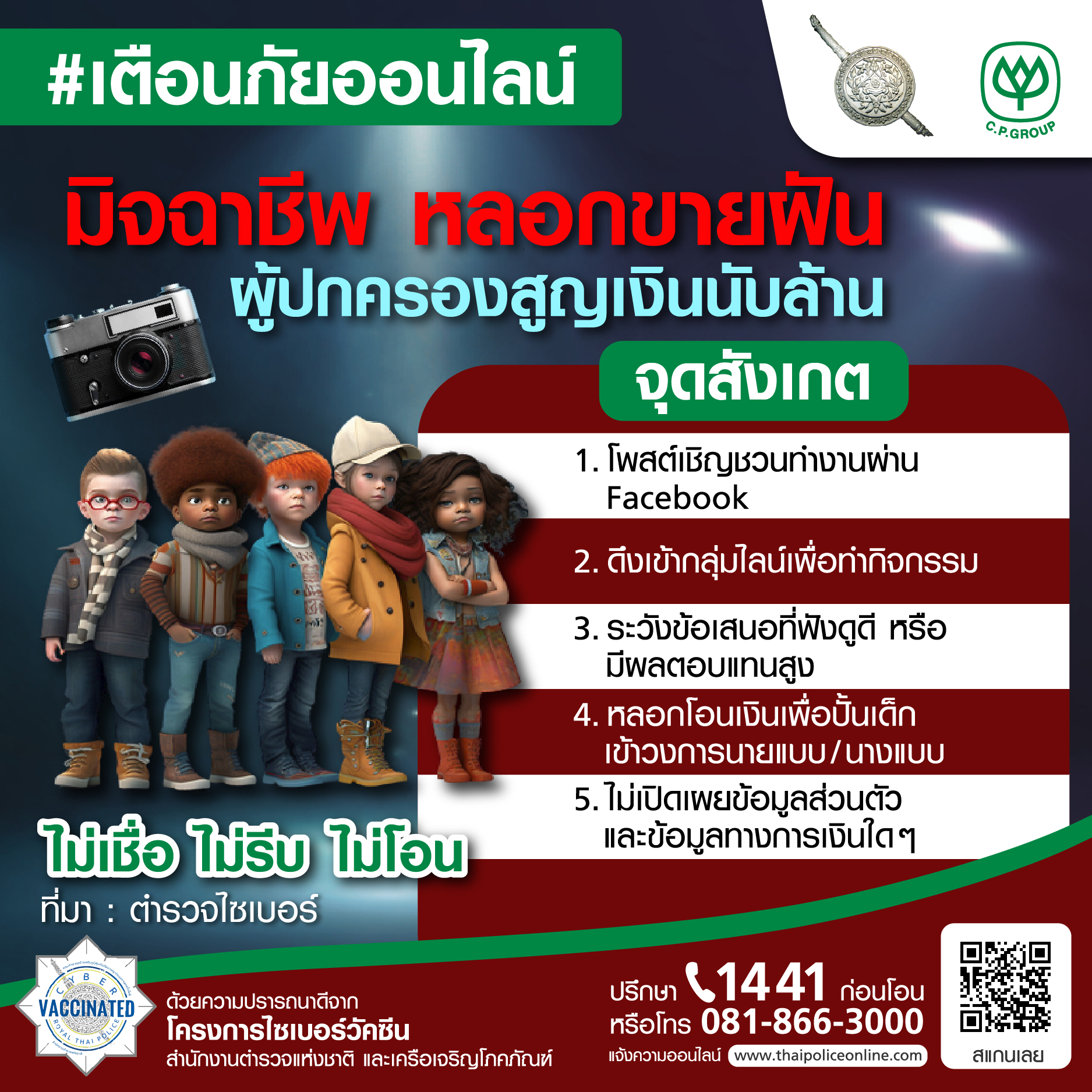 มีผู้เสียหายหลายราย ซึ่งส่วนใหญ่เป็นผู้ปกครองที่ต้องการให้บุตรหลานของตนเข้าสู่วงการเป็นนายแบบหรือนางแบบเด็ก ถูกมิจฉาชีพหลอกลวงโดยการสร้างเพจ facebook ปลอมขึ้นมา เช่น เพจ Child model kids, KID Model 2023, Summer Model, Fashion Kid เป็นต้น เพื่อหลอกลวงผู้เสียหายให้สมัครลงทะเบียนเข้าร่วมการคัดเลือกนายแบบนางแบบเด็ก อ้างว่าเมื่อผ่านการคัดเลือกจะได้รับสิทธิประโยชน์ต่างๆ เช่น เดินแบบร่วมกับแบรนด์ที่มีชื่อเสียงของห้างสรรพสินค้า ได้รับเงินเดือน ได้รับค่าคอมมิชชันต่างๆ เป็นต้น หรือถ่ายแบบแฟชั่นเสื้อผ้าเด็ก มีรายได้ 450-750 บาทต่องาน ไม่มีค่าใช้จ่ายในการสมัคร