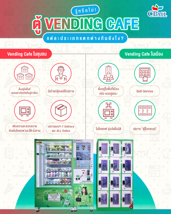 หลายคนอาจจะเคยเห็นตู้ vending machine ของ 7-Eleven ตั้งอยู่ในบางพื้นที่ ซึ่งภายในตู้ได้จำหน่ายสินค้าหลากหลายชนิด ไม่ว่าจะเป็นของคาว ของหวาน ของทานเล่น หรือแม้แต่เครื่องดื่ม หากเป็นอาหารที่ต้องอุ่นก่อนทาน ก็มีไมโครเวฟไว้คอยบริการ และเมื่อซื้ออาหารจากเครื่องเสร็จแล้ว บางที่ยังมีที่นั่งให้ลูกค้าได้ทานอาหารอีกด้วย