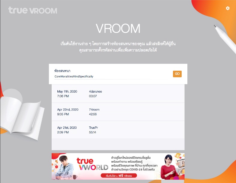 กลุ่มทรู นำศักยภาพด้านเทคโนโลยีสื่อสารดิจิทัล สร้างสรรค์ True VROOM ห้องประชุมและห้องเรียนเสมือนจริง หนึ่งในแพลตฟอร์มคุณภาพภายใต้ True Virtual World หรือ True VWORLD ที่นวัตกรทรู ได้พัฒนาขึ้นเพื่อเป็นอีกหนึ่งตัวช่วยให้คนไทยที่ทำงานและเรียนออนไลน์อยู่ที่บ้าน สามารถใช้งานได้อย่างมีประสิทธิภาพเทียบเท่ามาตรฐานสากล ใช้งานง่ายด้วยคุณสมบัติครบครันและปลอดภัย รองรับทั้งในรูปแบบแอปพลิเคชัน True VROOM สำหรับ iOS และ Android และบนคอมพิวเตอร์ผ่านเว็บไซต์ https://vroom.truevirtualworld.com/ ให้ใช้ฟรี พิเศษลูกค้าทรูมูฟ เอช ไม่เสียค่าอินเทอร์เน็ตอีกด้วย