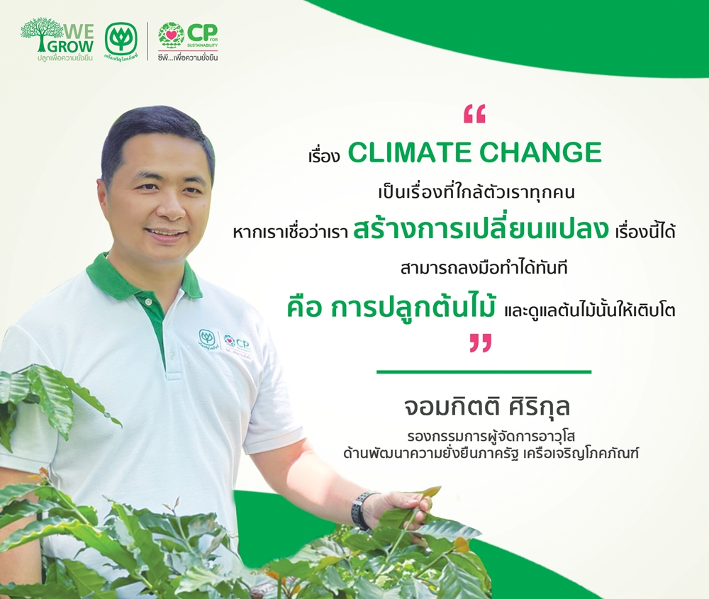 คุณจอมกิตติ ศิริกุล กล่าวว่า ปัญหาภาวะโลกร้อนและการเปลี่ยนแปลงสภาพภูมิอากาศในช่วงหลายสิบปีที่ผ่านมา ส่งผล กระทบทั้งทางตรงและทางอ้อมต่อการดำรงชีวิตประชาชน โดยเฉพาะเกษตรกรที่ต้องพึ่งพาน้ำในการทำการเกษตร ซึ่งเครือเจริญโภคภัณฑ์โดย ศุภชัย เจียรวนนท์ ประธานคณะผู้บริหาร เล็งเห็นปัญหาและผลกระทบดังกล่าว ได้ประกาศเป็นนโยบายที่ทุกกลุ่มธุรกิจในเครือฯ ต้องขับเคลื่อนมิติด้านความยั่งยืนควบคู่กับการดำเนินธุรกิจ และร่วมขับเคลื่อนเป้าหมายการลดผลกระทบจากการเปลี่ยนแปลงสภาพภูมิอากาศ ( Climate Change ) และการปลูกต้นไม้เพิ่มพื้นที่สีเขียวให้แก่โลกของเรา